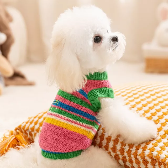 Keep your furry friend warm and stylish this season with our Colorful Striped Dog Sweater. Designed especially for small breeds like Maltese, Bichon Frise, and Teddy dogs, this knit pullover combines comfort, warmth, and vibrant charm. The sleeveless design makes it easy to slip on and off, while the soft polyester fiber ensures your pet stays snug without feeling restricted.
