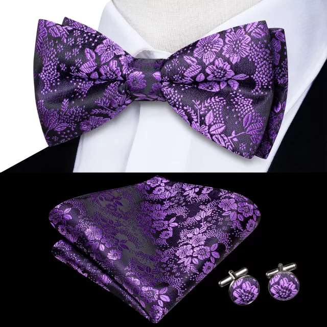 Step into sophistication with this purple floral silk bow tie set, designed to elevate your look with timeless charm and modern elegance. Crafted from premium silk with a delicate tatting weave, this pre-tied butterfly knot bow tie ensures a flawless finish every time. The set includes a matching pocket square and cufflinks, giving you a complete and coordinated accessory ensemble that speaks of refinement.